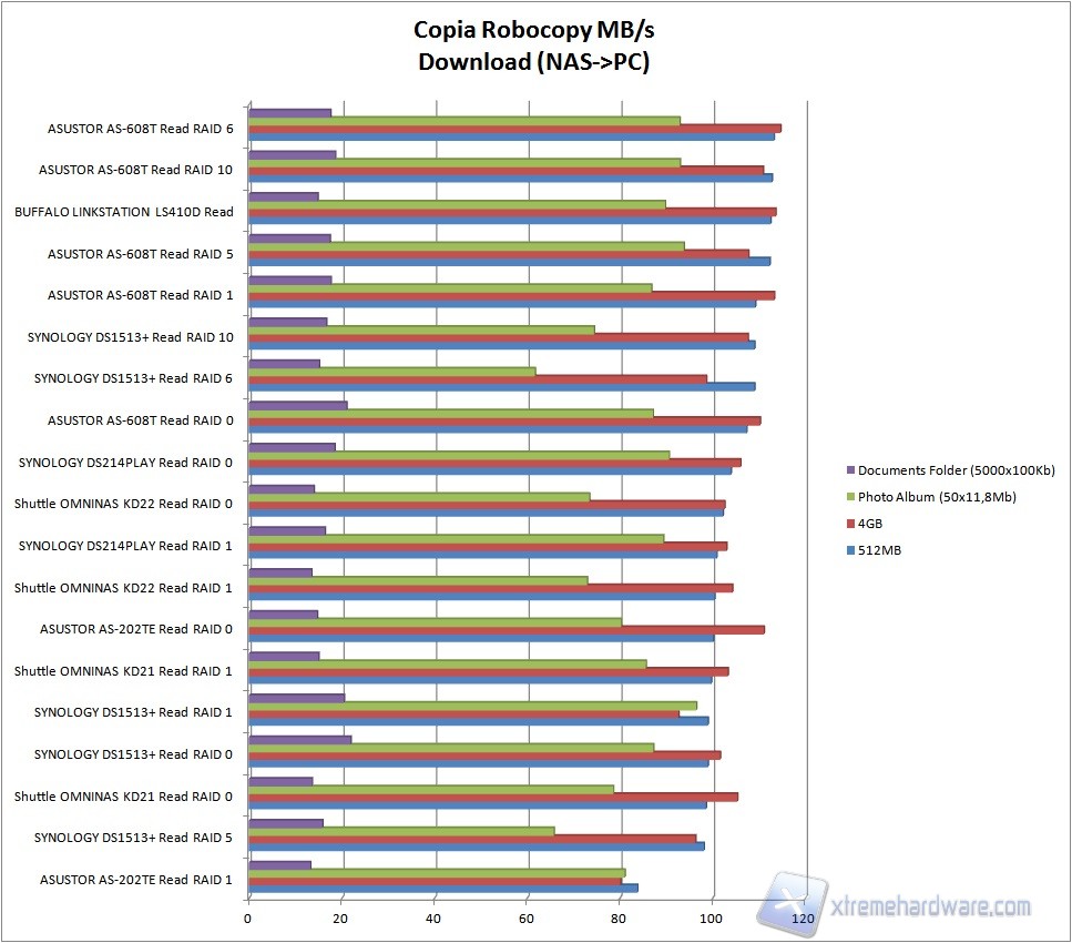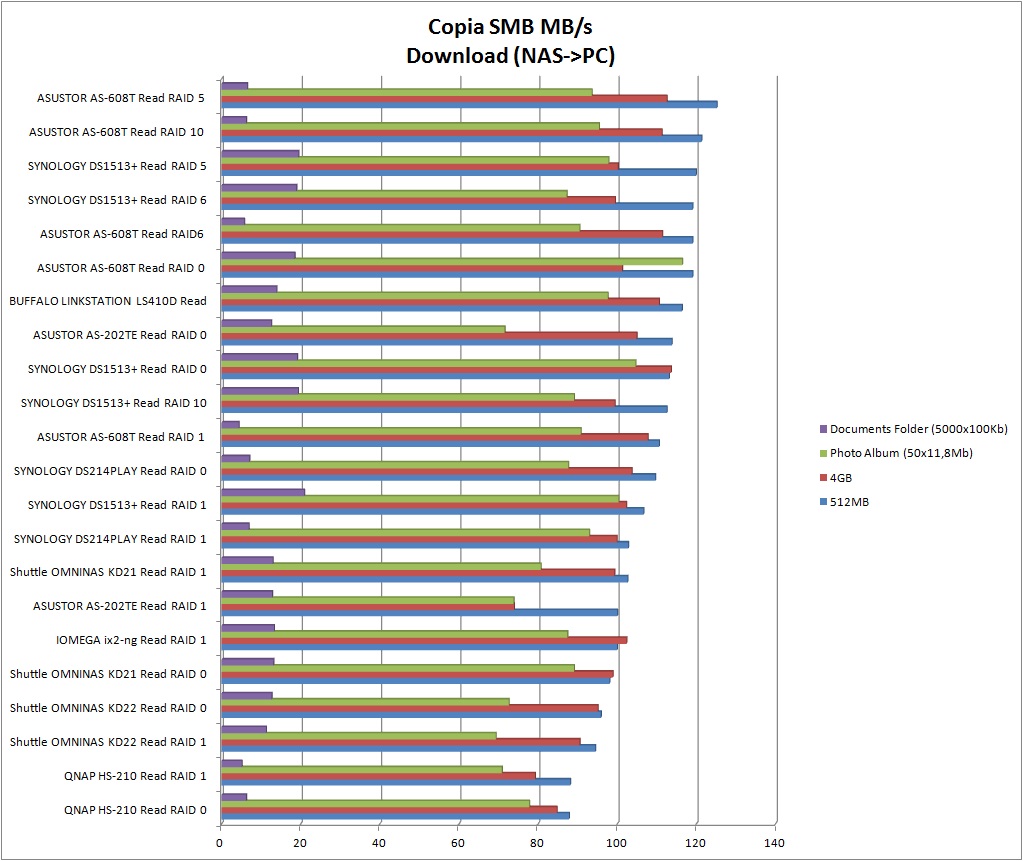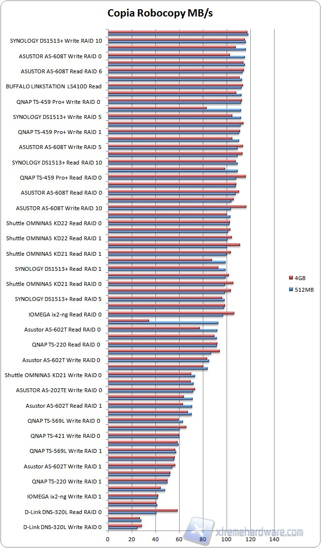 Anche in questo caso le performance in download si alzano notevolmente facendo posizionare l'AS-202TE RAID0 nella prima metà della classifica con punte di 113,78MB/s.