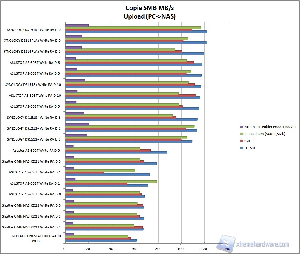 Il primo grafico, relativo all'upload di file dal PC verso il NAS, mostra l'Asustor AS-202TE nella metà della classifica, in configurazione RAID1, e nella seconda metà in configurazione RAID0.